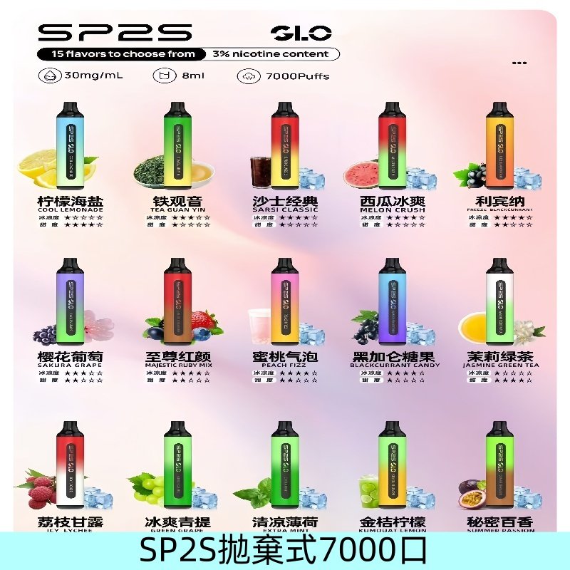 SP2S GLO 7000口一次性電子煙,配備8mL大容量煙油與600mAh電池,提供15種精緻口味,涵蓋水果、清涼、茶飲等,滿足多元需求。採用雙芯霧化技術,煙霧細膩,擊喉感純正,支援Type-C快充。